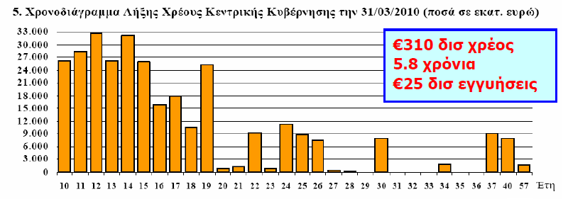 Τα διαγράμματα που παρατίθενται, έχουν εξαχθεί από τα επίσημα τριμηνιαία Δελτία Δημόσιου Χρέους του ΥΠΟΙΚ. Σ’ αυτά φαίνεται το προφίλ του ελληνικού χρέους σε δύο χρονικές στιγμές: (α) στις 31 Μαρτίου 2010, μερικές εβδομάδες πριν την απόφαση καταφυγής στην τρόικα, (β) στις 31 Μαρτίου 2013, το τελευταίο διαθέσιμο – θεωρητικά επί τη βάσει του οποίου γίνεται ο όποιος προγραμματισμός.