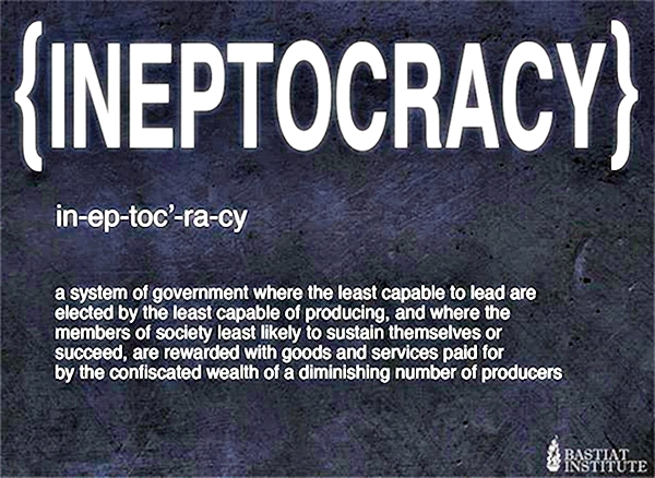 Πρόσφατα βρήκα λέξη που πρωτοεμφανίστηκε το 2006: «Ineptocracy». Ελληνικά μεταφράζεται «Αδεξιοκρατία» που ορίζεται ως: «Σύστημα διακυβέρνησης όπου οι λιγότερο ικανοί να ηγηθούν εκλέγονται από τους λιγότερο ικανούς να παράγουν, και στο οποίο τα λιγότερο ικανά μέλη της κοινωνίας να επιβιώσουν ή να επιτύχουν, επιβραβεύονται με αγαθά και υπηρεσίες που πληρώνονται από τον κατασχεμένο πλούτο ενός ολοένα και συρρικνούμενου αριθμού παραγωγικών ατόμων». Αυτό περιγράφει την εικόνα της Ελλάδας των τελευταίων δεκαετιών.